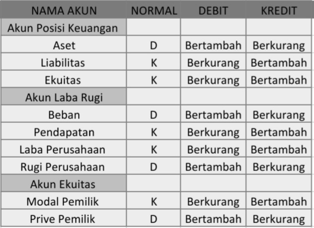 Akun-akun yang normalnya pada Debit (D) akan bertambah jika posisinya berada di kolom Debit, dan akan berkurang jika posisinya berada di kolom Kredit. Sebaliknya, akun yang normalnya pada Kredit (K) akan bertambah jika posisinya berada di kolom Kredit, dan akan berkurang jika posisinya berada di kolom Debit.